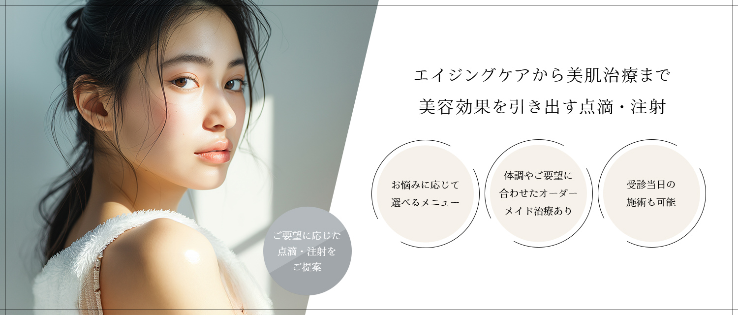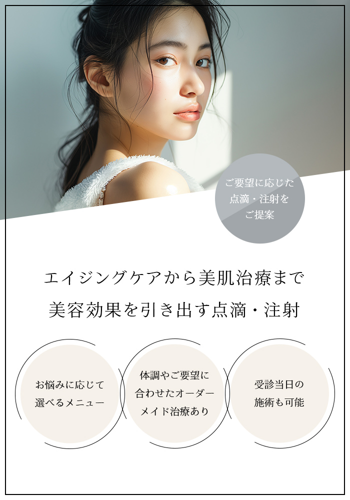 当院では、ビタミンやプラセンタなど、美容や健康に働きかける成分を配合した美容点滴・注射治療をご提供しております。内服よりも効率よく成分を吸収でき、美肌効果やエイジングケア、体調を整える作用などが期待できます。受診当日に施術を受けていただけるため、仕事やご家庭のことで忙しいかたにも人気です。お悩みや目的に合わせた点滴・注射をご提案いたしますので、ご興味のあるかたはお気軽にご相談ください。