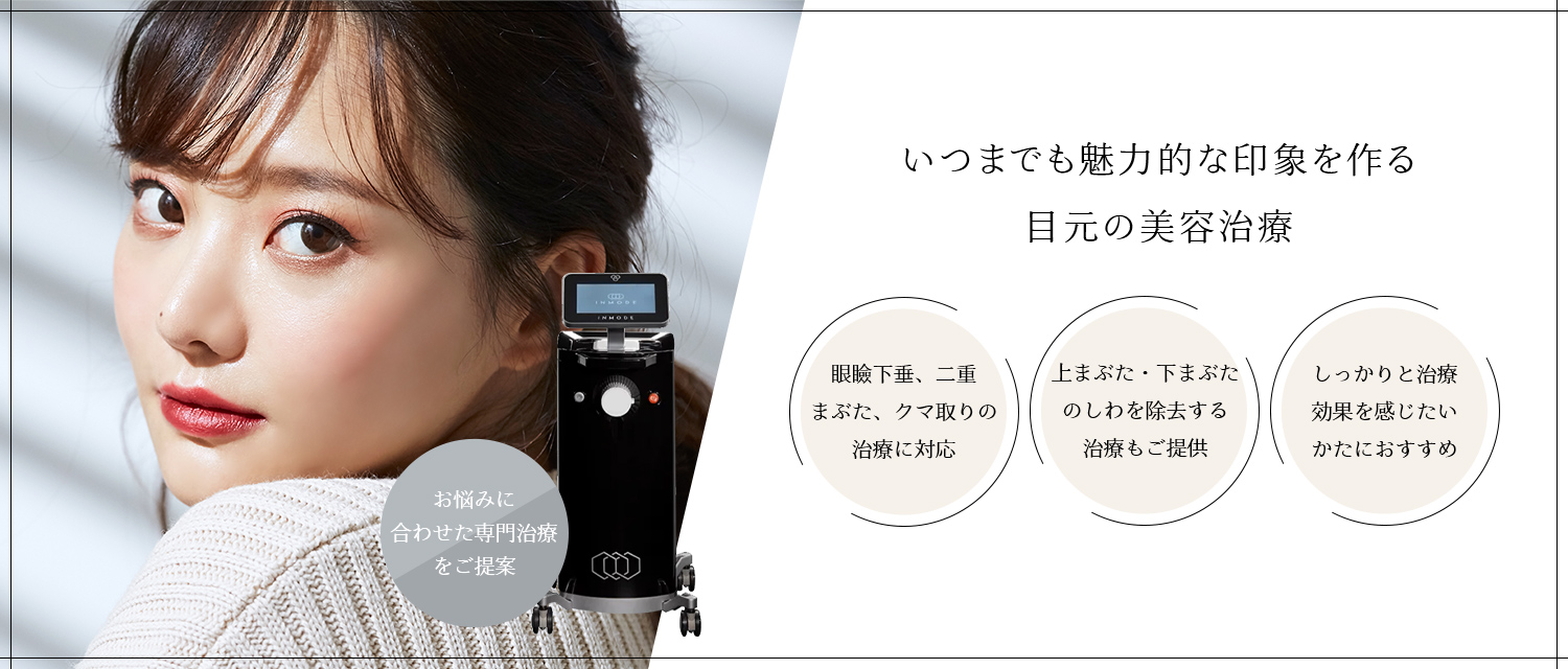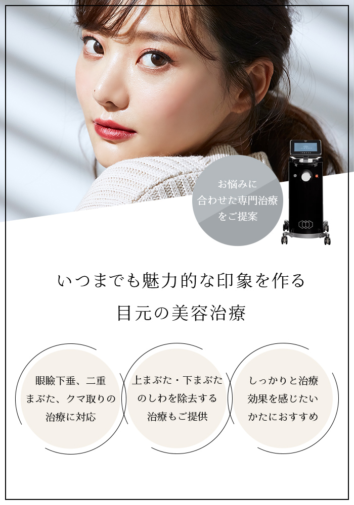 目元は顔の印象を大きく左右する重要なパーツでありながら、年齢とともに小じわ・たるみ・クマなどのお悩みが現れやすい部位です。当院では、目元のお悩みに応じた美容治療を行い、自然でハリのある目元を目指します。目元のしわやたるみが気になり始めたかたも、ぜひ一度ご相談ください。