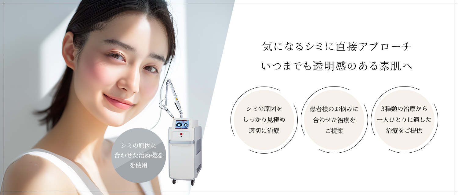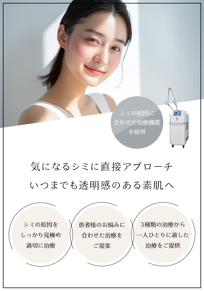 加齢や紫外線、ホルモンバランスの変化などにより、シミに悩むかたは少なくありません。当院では、シミの種類や原因を丁寧に見極め、適切な治療をご提案しております。シミの状態に応じて、レーザー治療・内服薬・外用薬などを組み合わせ、一人ひとりに合わせた治療をご提供いたします。患者様の肌質やライフスタイルに合わせてご提案いたしますので、まずはお気軽にご相談ください。